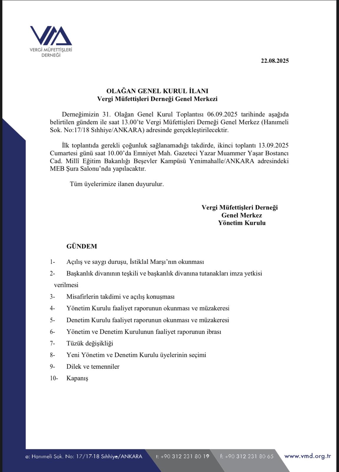 VERGİ MÜFETTİŞLERİ DERNEĞİ GENEL MERKEZ 31. OLAĞAN GENEL KURUL İLANI