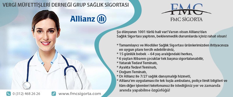 Vergi Müfettişleri Derneği olarak dernek üyelerimiz ve 1. derece yakınlarının sağlık hizmetlerinden faydalanabilmeleri üzere Allianz Sigorta ile üyelerimiz eş ve çocukları için %20, anne-baba ve kardeşleri için %15 indirim anlaşması yapılmıştır.