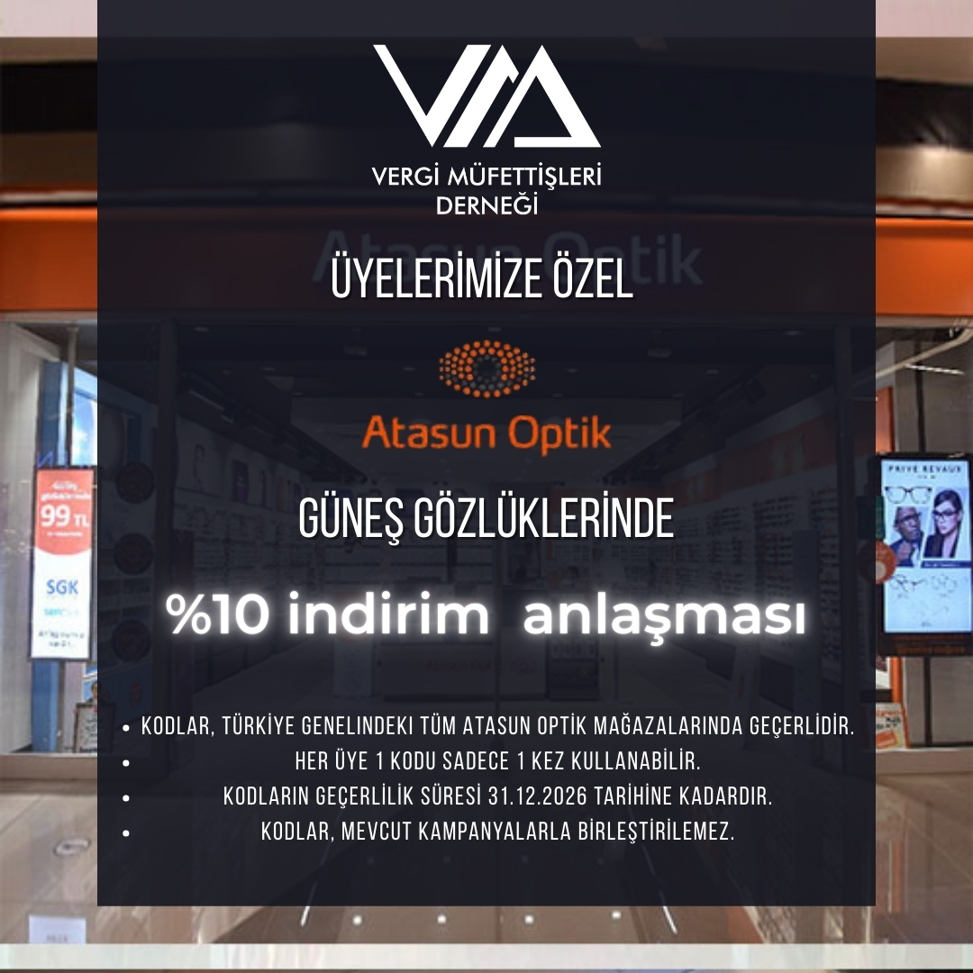 Atasun Optik ile tüm Türkiye’de geçerli güneş gözlüklerinde %10 indirim anlaşması yapılmıştır. Her bir üyemize özel tek kullanımlık indirim kodunuzu almak için Dernek Sekreterimiz Asuman Hanım’a ulaşabilirsiniz.