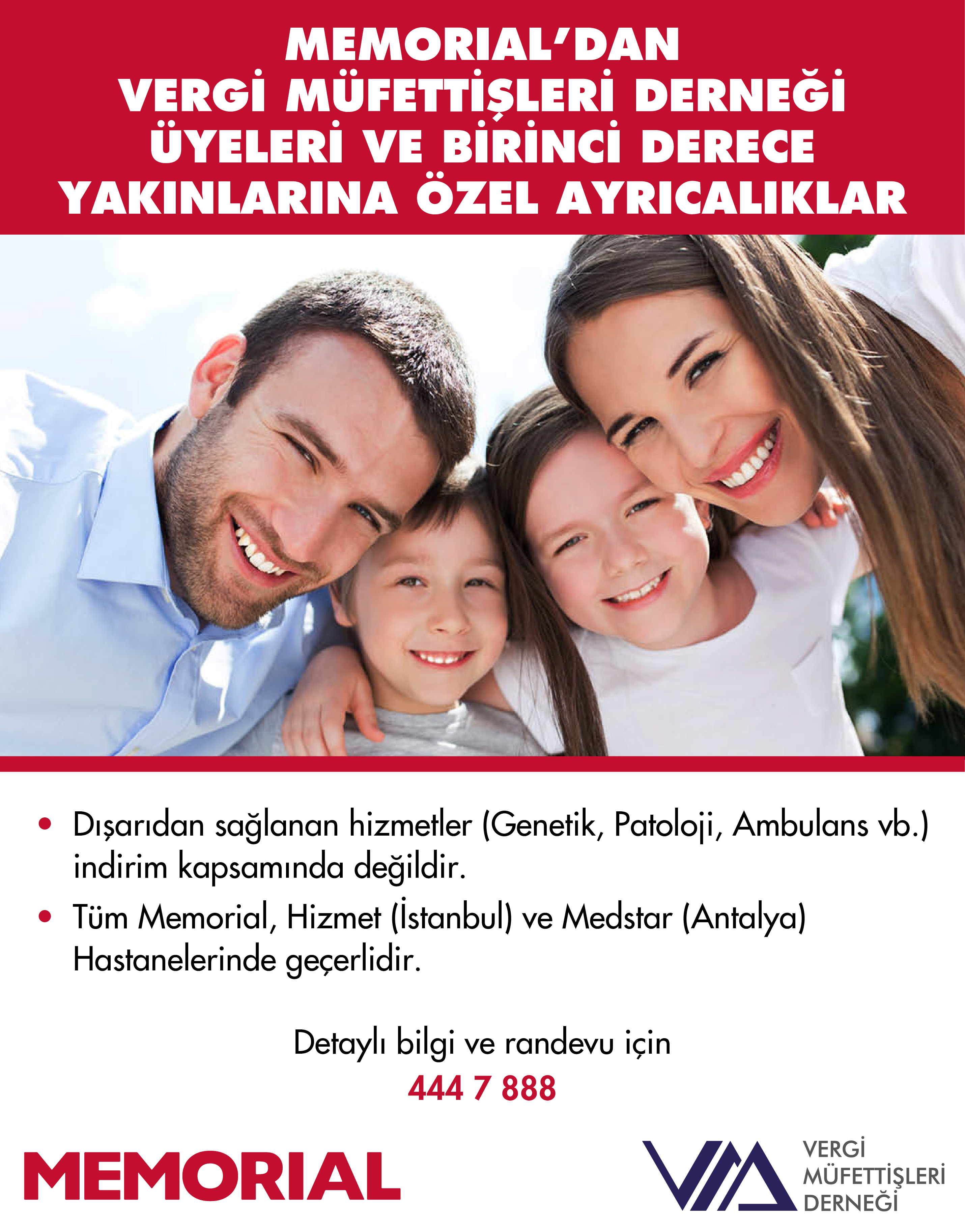 Vergi Müfettişleri Derneği olarak dernek üyelerimiz ve 1. derece yakınlarının sağlık hizmetlerinden faydalanabilmeleri için Memorial Hastanesi ile %15 indirim anlaşması yapılmıştır.