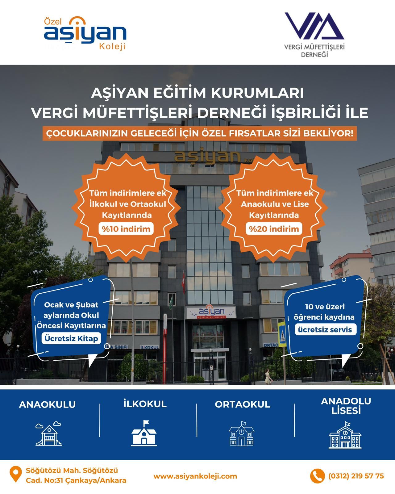 Vergi Müfettişleri Derneği olarak üyelerimizin çocuklarının eğitimi için ÖZEL AŞİYAN EĞİTİM KURUMLARI ile indirim anlaşması yapılmıştır.