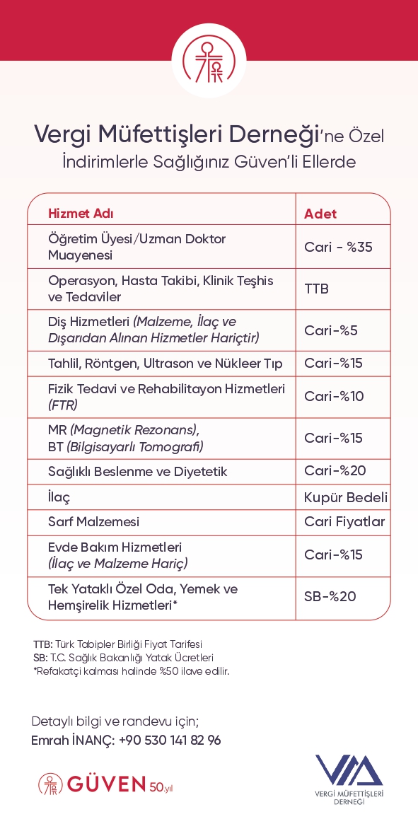 VERGİ MÜFETTİŞLERİ DERNEĞİ olarak dernek üyelerimiz ve birinci derece yakınlarının sağlık hizmetlerinden yararlanabilmeleri için, GÜVEN HASTANESİ ile indirim anlaşması yapılmıştır. Söz konusu indirim oranlarına aşağıda yer alan tabloda yer verilmiştir.